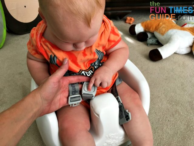 The Bumbo chair has a great safety feature, too. You can use the attached, storable straps to secure the Bumbo baby seat to any chair. This also eliminates our need for an additional high chair at this stage. The Bumbo also has the waist strap to keep baby secure.
