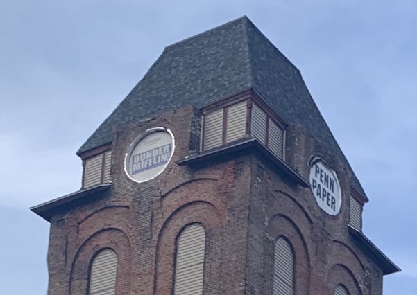 These days there’s a “Dunder Mifflin Paper Company” logo at the top of the tower: